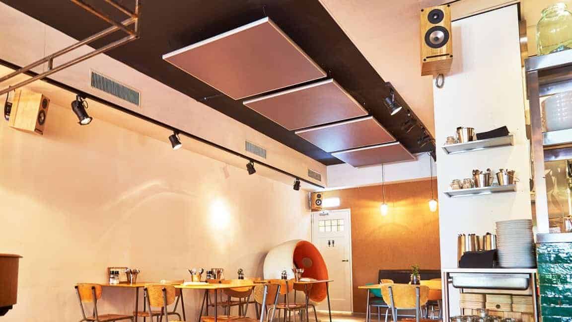 De panelen zijn, zoveel mogelijk gelijkmatig verdeeld, boven de zones opgehangen die akoestisch het belangrijkste zijn: boven de tafels, bij de bar en bij de plek waar muziek gemaakt wordt.