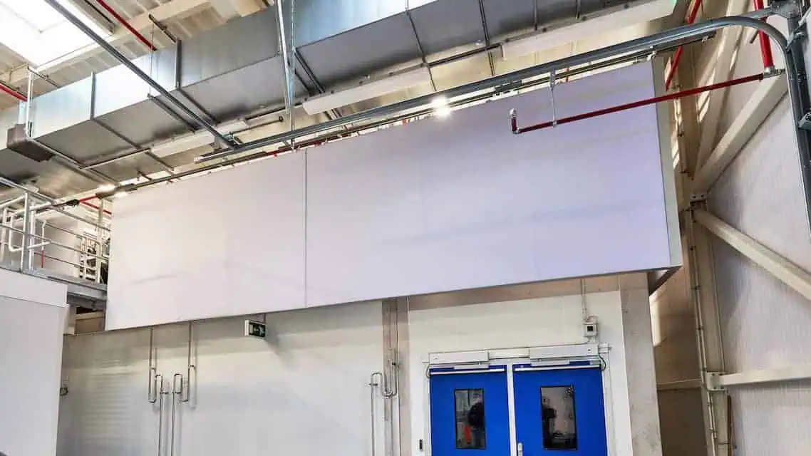 Aan beide zijden akoestisch doek met afbeelding, aluminium frame en 4 cm akoestisch dempingsmateriaal.